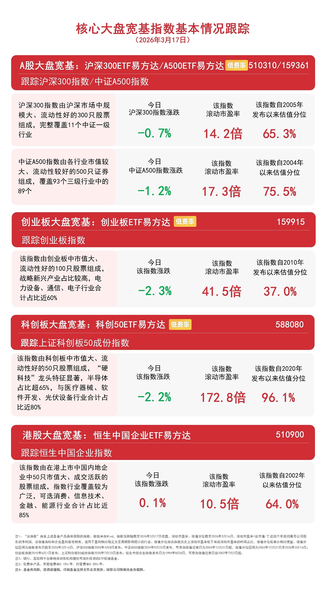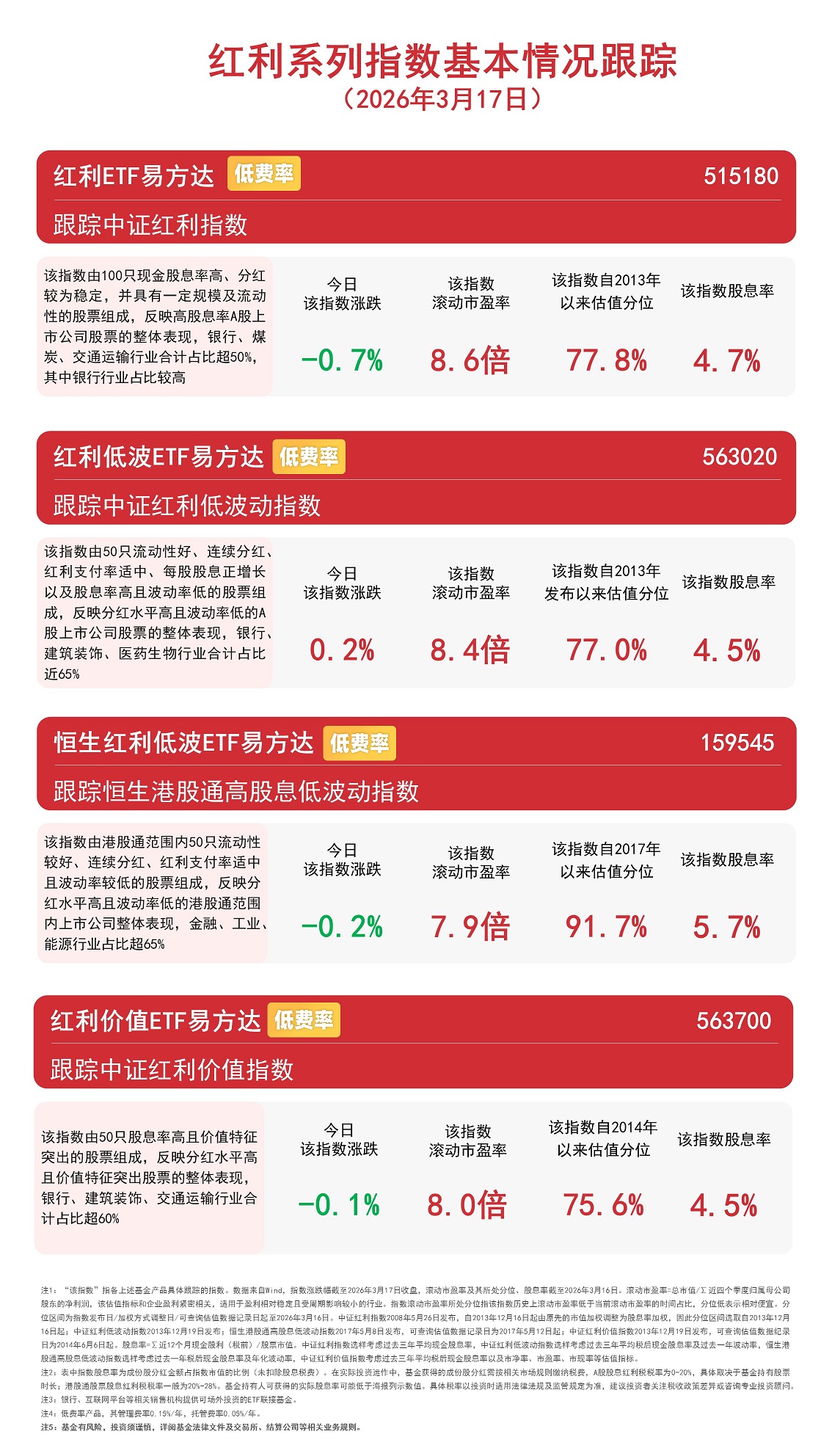 3月17日,大盘冲高回落,午后持续回调,“红利+”指数小幅下挫。截至收盘,国证价值100指数下跌0.4%,中证红利指数下跌0.7%,国证自由现金流指数下跌1.0%,价值ETF易方达(159263,联接基金A/C:025497/025498)和自由现金流ETF易方达(159222,联接基金A/C:024566/024567)全天分别获3800万份和4700万份净申购。