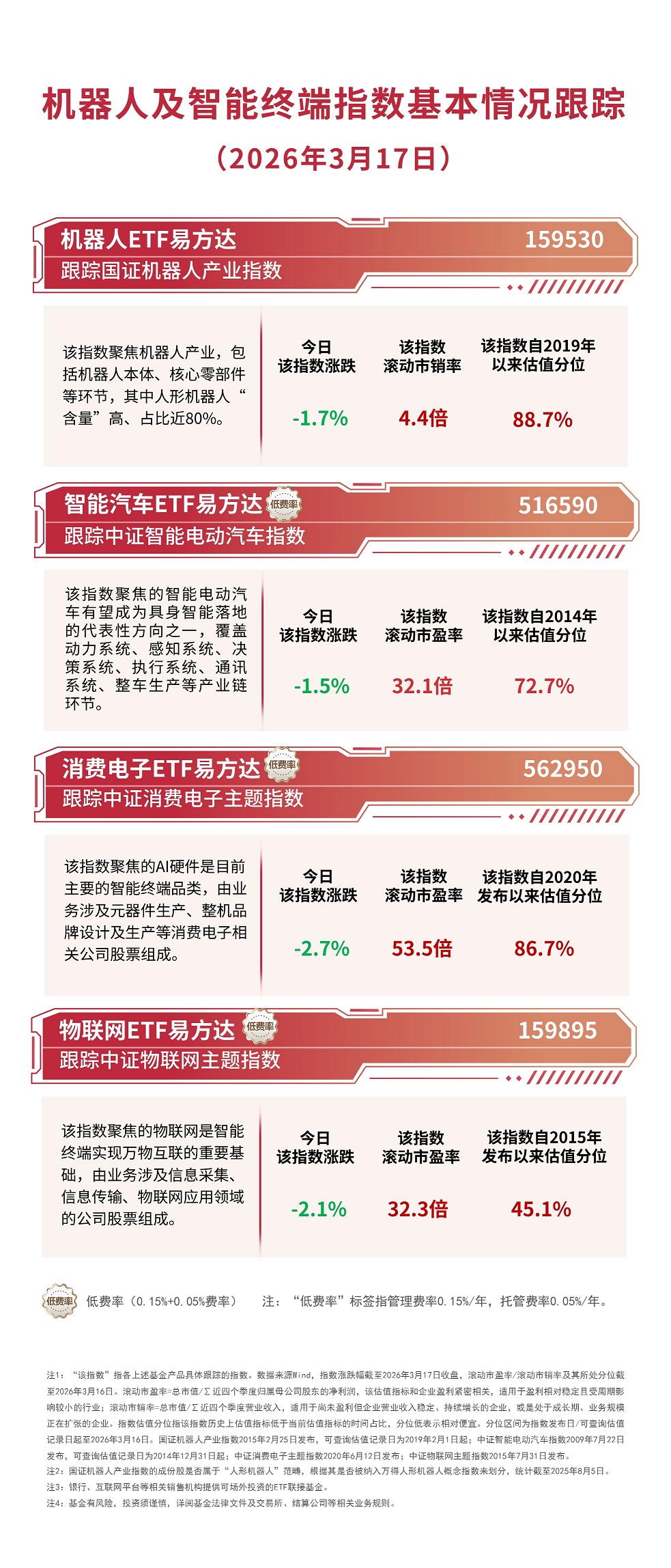 截至收盘,国证机器人产业指数下跌1.7%,中证智能电动汽车指数下跌1.5%,中证消费电子主题指数下跌2.7%,中证物联网主题指数下跌2.1%,机器人ETF易方达(159530,联接基金A/C:020972/020973)逆势获1000万份净申购。