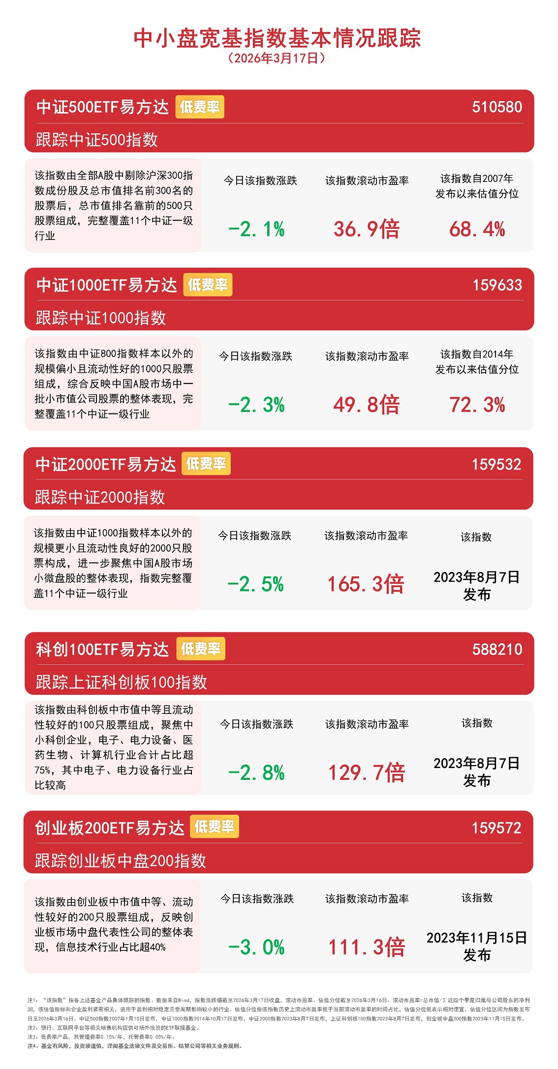 截至收盘,创业板指数下跌2.3%,创业板中盘200指数下跌3.0%,创业板成长指数下跌3.1%,创业板ETF易方达(159915,联接基金A/C/Y:110026/004744/022907)全天净申购超2亿份。